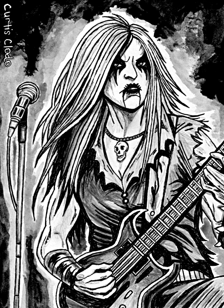 Ce soir, un cru entièrement féminin se montre particulièrement apte à casser la baraque. Des statues squelettiques bordent la scène où se produit le groupe Noire Ecchymose. Leur chanteuse et guitariste principale, une possédée à la peau spectrale contrastant avec une peinture charbon monstrueusement appliquée, formant des pics autour de ses yeux et de sa bouche, était arrivée dans un nuage de fumée, fulminant jusqu’à l’heure de l’hymne fédérateur de son groupe. Presque chaque membre de la horde entonne avec elle, après l’introduction de la bassiste :